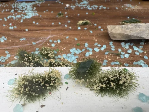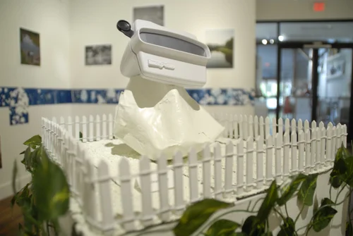 Install shot from Holden Gallery, Warren Wilson College Faculty Show, Spring 2022. Photographs from Judaculla Rock with papier mache rocks created from a shredded copy of Journey to the Centre of the Earth